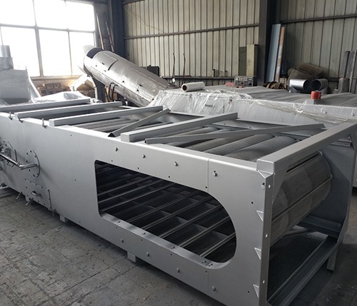 框架安装在格栅通道的,框架两侧与格栅通道之间的间隙是格栅过滤后出水的通道。框架迎水端两侧与渠壁之间设置导流挡板,可防止污水短流直接进入后过滤。框架下部的迎水端开有进水孔,相对侧为封闭端。污水从进水孔流入机器,然后从两侧的网板流出,通过两侧的出水通道流入机器的后通道。